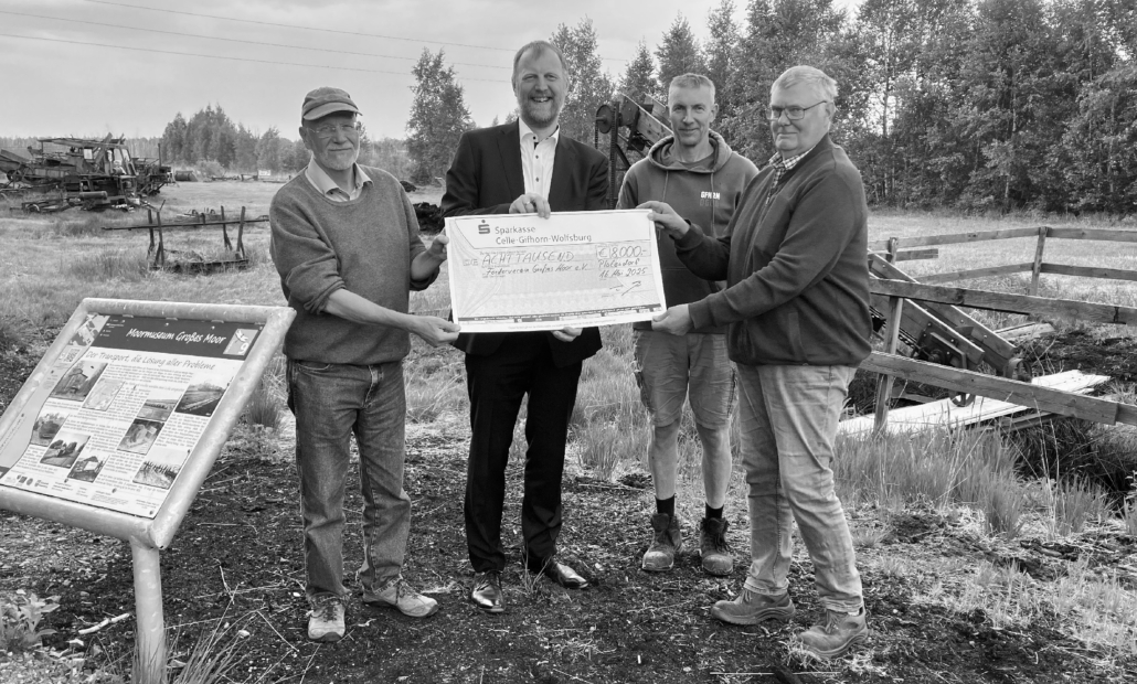 Die Stiftergemeinschaft der Sparkasse Celle-Gifhorn-Wolfsburg unterstützt mit 8.000 Euro den Förderverein Großes Moor e.V. und sorgt somit für ein ganz besonderes Museumserlebnis bei Platendorf. „Unser Dank gilt hierbei den vielen Freiwilligen, die uns in der Vergangenheit auf so unterschiedliche Art und Weise unterstützt haben. Und natürlich im Besonderen der Stiftergemeinschaft für deren finanziellen Support. Ohne diesen wäre es uns in diesem Jahr nicht möglich gewesen, die notwendigen Restarbeiten am Rundweg und am Ballenboden erfolgreich zu erledigen“, sagt Detlev Junge, 1. Vorsitzender des Fördervereins. Und Vorstandskollege Jörg Wulfes ergänzt: „Die Rückmeldungen vieler Besucherinnen und Besucher sind total positiv und bestätigen uns in unserem Engagement für diesen einzigartigen Ort.“
